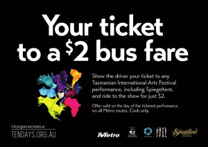 Metro Tasmania is thrilled to be partnering with Ten Days on the Island to offer Tasmanian International Arts Festival ticket holders $2 flat fare bus tickets on the day of the event they are attending.