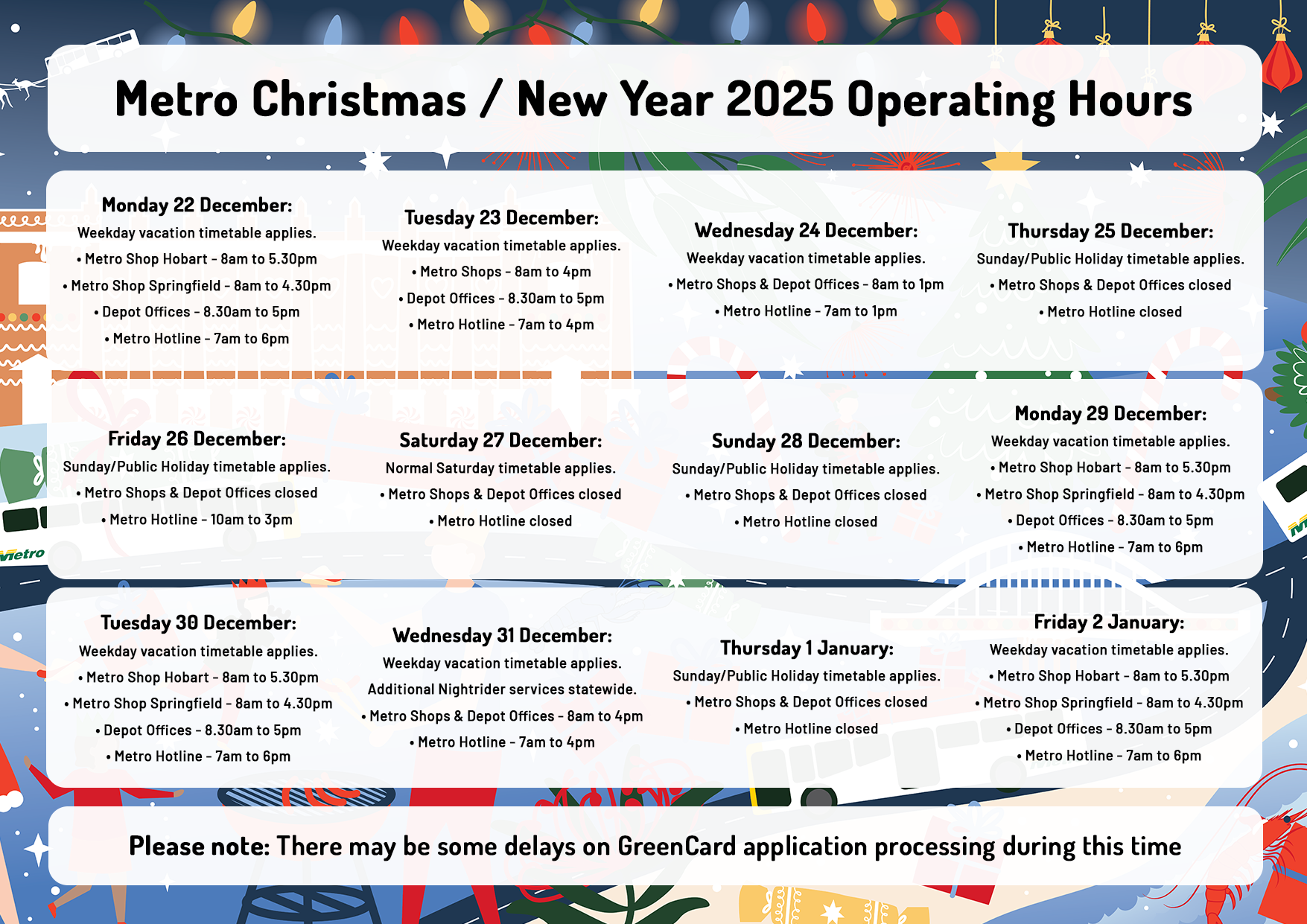 Need to plan a trip over the Christmas / New Year period? We’ve got you covered! See below for a quick reference of Metro’s Depot Offices (Burnie & Launceston), Metro Shops (Springfield & Hobart), Hotline (13 22 01) and Timetable information from December 22 to January 2. Alternatively, plan your trip with our online trip planner!